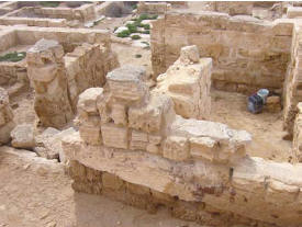 بدأ العالم الألمانى كاوفمان بالحفريات فى هذه المنطقة واكتشف بعض المعالم وذلك فى المدة من 1905 - 1907 ، وبعد اكتشافها قام بنقل 100 صندوق من الحجم الكبير الى بلده مملوء تحفا بديعة وتيجان الأعمدة الرخامية وأشياء كثيرة ، هذه لا زال موجودة فى متحف فرانكفورت بألمانيا الغربية وتحركت متاحف العالم للاستيلاء على هذه الآثار ولكن كاوفمان كان قد أستولى على أغلبها .